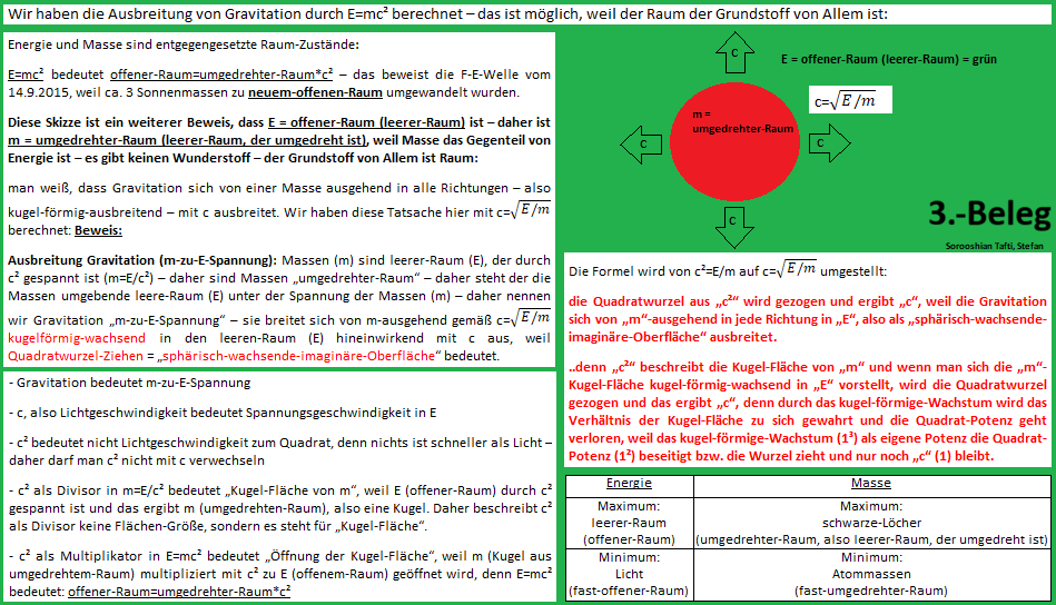 Im 3.-Beleg ist die Ausbreitung von Gravitation durch E=mc² dargestellt – das heißt, dass die F-E-Welle vom 14.9.2015 (2.-Beleg) deckungsgleich mit Gravitationsausbreitung ist und daher Gravitationswellen mit der F-E-Welle am 14.9.2015 einhergingen, weil sich beides gemäß E=mc² bzw. gemäß c=Wurzel aus E geteilt durch m ausbreitet – also vom Ursprung (m) ausgehend kugelförmig-wachsend mit c im leeren-Raum (E) ausbreitet, weil eine sphärisch-wachsende-Oberfläche dem Quadratwurzelziehen entspricht und sich daraus c ergibt.