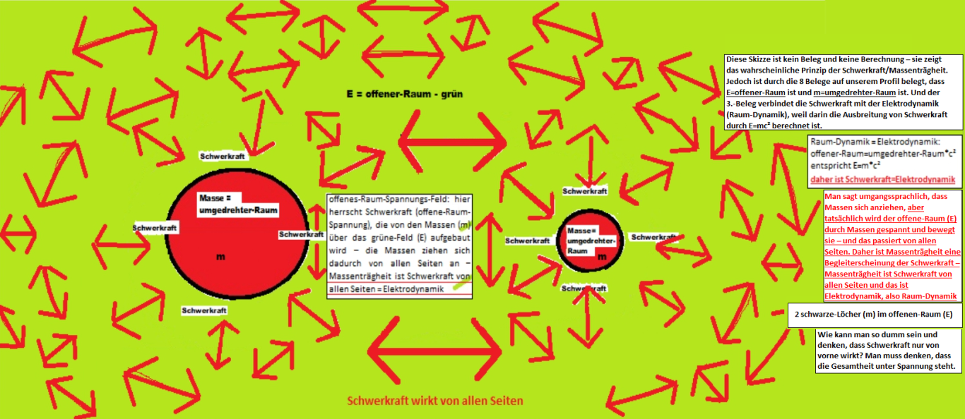 der Unterschied zwischen „Verhaltensbeschreibung“ und „Ursachenerklärung“: Albert Einstein hat die ART erstellt, weil er die mathematischen Verhaltensbeschreibungen zur Schwerkraft von Newton nicht mit der SRT vereinbaren konnte – damit beging er einen Fehler, denn eine Verhaltensbeschreibung macht es unmöglich, eine Ursache zu erkennen – daher sind Schwerkraft und Massenträgheit bisher nur 2 getrennte (ursachenlose) mathematische Verhaltensbeschreibungen. Man muss alles in Gesamtheit betrachten – Schwerkraft ist kein Seil, das zwischen 2 Kugeln gespannt ist und es gibt keine Trichter und keine Murmeln und kein gekrümmtes Raumtuch und kein Raum-Zeit-Gitter – man muss Schwerkraft/Massenträgheit ursächlich als eine Sache verstehen: die sogenannte Spaghettisierung eines Objekts (Stern) an einem schwarzen-Loch wird dadurch ausgelöst, dass der Stern durch die Schwerkraft des schwarzen-Lochs in das schwarze-Loch gezogen wird und gleichzeitig von allen Seiten vom schwarzen-Loch (m) über den offenen-Raum (E) festgehalten wird. Es ist das schwarze-Loch selbst, das das Objekt von hinten (von allen Seiten) festhält, während es das Objekt von vorne anzieht.. das kommt daher, dass Massen (m) sich von allen Seiten über den offenen-Raum (E) anziehen/anspannen, weil alles in Gesamtheit mit sich wirkt. Gravitation ist Elektrodynamik, ist Raum-Dynamik, also ist Alles E=mc². Alle 4 Grundkräfte sind Elektrodynamik (Raum-Dynamik). In der Skizze unten zeigen wir das wahrscheinliche Prinzip der Schwerkraft/Massenträgheit – dazu gibt es noch keine Ursachen-Formel: Massen (m) ziehen sich von allen Seiten an – also zieht die Sonne die Erde von allen Seiten an und umgekehrt, also ziehen sie sich auch von hinten an = Massenträgheit – bzw. ziehen sich Himmelskörper nicht von allen Seiten an, sondern ihre Spannungen (m) sind stets auf den leeren-Raum (E) wirkend, der sie von allen Seiten unter Spannung hält – dieses Prinzip wird durch gravity-probe-b gestützt – da gravity-probe-b bewiesen hat, dass der Raum verdrehbar ist. Man muss denken, dass Massen (m) – hier schwarze-Löcher (m) – sich gar nicht anziehen, sondern nicht miteinander fusionieren wollen, denn sie sind „zufriedene-Raum/Kugel-Spannungen“, gemäß m=E/c², im leeren-Raum (E). Sie sind gezwungen, zu fusionieren, weil ihre Kugel-Spannungen (m) auf den leeren-Raum (E) wirken, der die Spannungen auf die Massen „zurücklenkt“ und die Massen dadurch von allen Seiten aufeinanderdrückt und unter Zwang miteinander fusioniert, wenn kein Bewegungs-Impuls dagegenwirkt. Ähnlich Elektrik: PLUS und PLUS stößt sich ab, genauso stößt sich MINUS und MINUS ab, während PLUS und MINUS sich anziehen.. ..dieses elektrische Prinzip kommt vom Raum, weil Alles E und m ist und beides Raum ist – es gibt nur Raum: eine Masse (m) ist mit dem leeren-Raum (E) vereint – denn E und m ziehen sich an (wie MINUS und PLUS) – daher befindet sich ein schwarzes-Loch (umgedrehter-Raum = m) perfekt im leeren-Raum (E). Wenn ein zweites schwarzes-Loch (m) dazukommt, drückt der leere-Raum (E) beide m aufeinander – die m wollen nicht miteinander fusionieren, weil ihre jeweiligen Spannungen (m) sie jeweils als „eigenständige-Kugel“ spannen, aber der leere-Raum (E) zwingt sie, weil ihre Kugel-Spannungen (m) auf den leeren-Raum (E) wirken, der die Spannungen auf die Massen „zurücklenkt“ und sie dadurch zusammendrückt und zwar von allen Seiten – dadurch fusionieren sie, wie U+D-Loch, die im Innern ihrer Fusion Protonen (UUD) ergeben haben, die aufgrund der Verspannung von m und m (U+D-Loch) in sich und nach außen unter Spannung stehen – daraus ergibt sich das PLUS und MINUS aus der Elektrik – das aus dem Proton (m, PLUS) resultierende Elektron (E, MINUS) liegt auf der leeren-Raum-Seite (E) und es ist verspannter-leerer-Raum, der aus dem verspannten Raum-Zustand des Protons resultiert – die Gesamtheit resultiert aus der Verspannung von U+D-Loch (siehe auch 8.-Beleg-Magnetfelder). Jetzt wieder Schwerkraft/Massenträgheit: Massen (m) – hier schwarze-Löcher – widerstreben einer Fusion, weil sie jeweils „zufriedene-Raum/Kugel-Spannungen“ (m) sind – diese Spannungen wirken auf den leeren-Raum (E), der die Spannungen auf die Massen „zurücklenkt“ – daher stehen die Massen von allen Seiten unter Spannung und das zeigt sich als Schwerkraft/Massenträgheit - siehe Skizze: